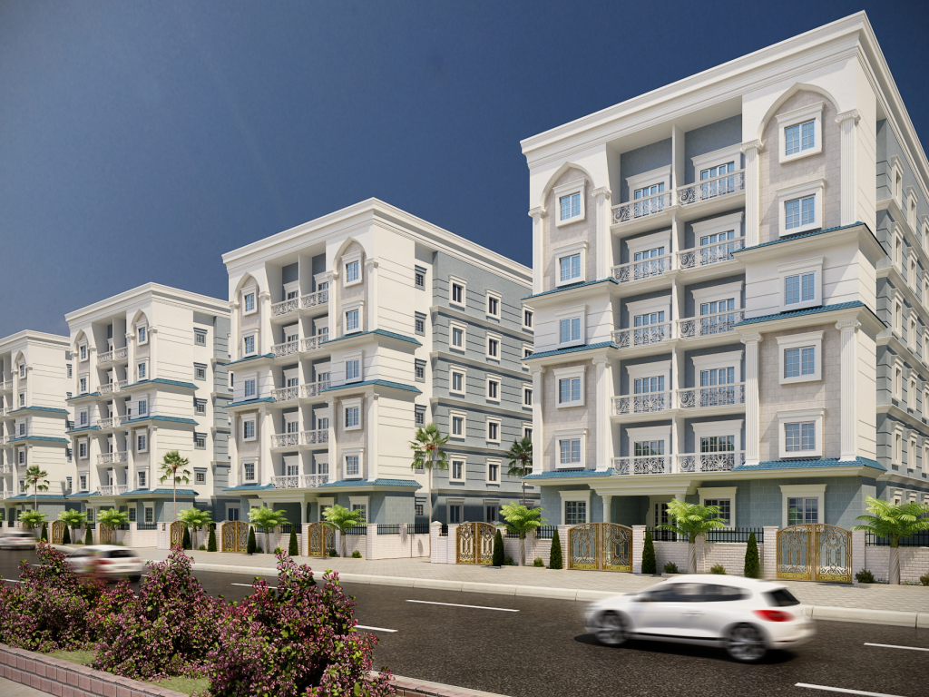 The building consists of 16 apartments in floors from the first to the fourth and 8 villas (4 ground duplexes and a basement & 4 penthouses and a fifth roof).